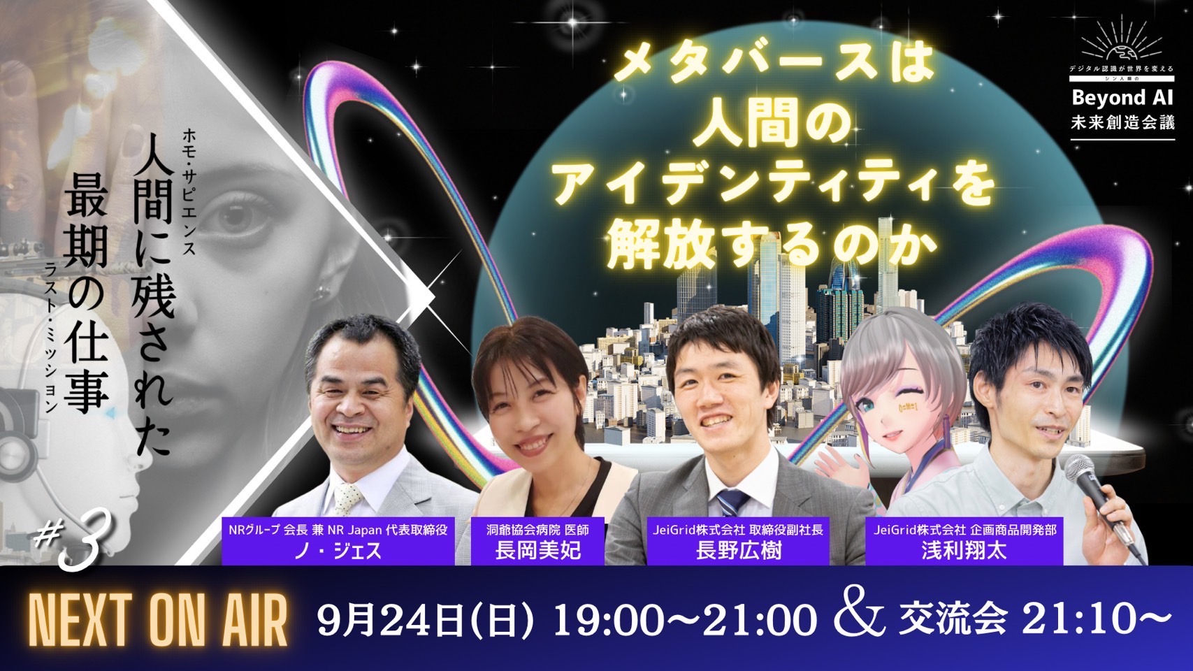 日本コンサルタントとして27年間、日本文明のアモールファティを語る21世紀の悟り人・令和哲学者のノ・ジェス氏、洞爺協会病院医師の長岡美妃氏、Next Renaissance地球市民会議発足準備委員会・JeiGridメンバーたちのファシリテートのもと、各界で活躍されているゲストを招き、視聴者参加型のトークライブを開催します。